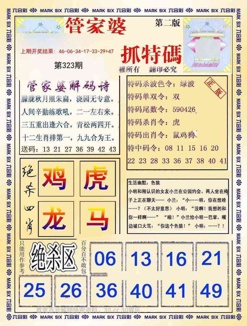 325期:特码暗语/曾道人救世心经/攻特料/六合心经/平码生肖点将